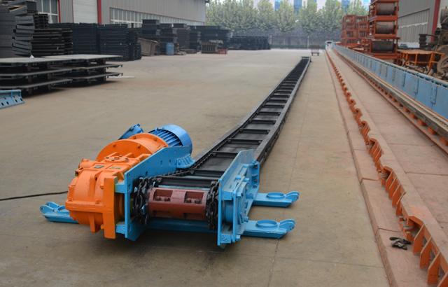 刮板輸送機(jī)的工作原理是,將敞開的溜槽,作為煤炭、矸石或物料等的承受件,將刮板固定在鏈條上(組成刮板鏈),作為牽引構(gòu)件。當(dāng)機(jī)頭傳動(dòng)部啟動(dòng)后,帶動(dòng)機(jī)頭軸上的鏈輪旋轉(zhuǎn),使刮板鏈循環(huán)運(yùn)行帶動(dòng)物料沿著溜槽移動(dòng),直至到機(jī)頭部卸載。刮板鏈繞過鏈輪作無級(jí)閉合循環(huán)運(yùn)行,完成物料的輸送。